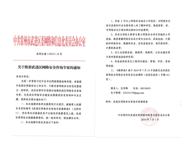 2019年7月1日,為進(jìn)一步貫徹習(xí)近平總書記網(wǎng)絡(luò)強(qiáng)國的戰(zhàn)略思想,有效提升武進(jìn)區(qū)網(wǎng)絡(luò)安全水平,不斷完善網(wǎng)絡(luò)安全防范處置能力,中共常州市武進(jìn)區(qū)委網(wǎng)絡(luò)和信息化委員辦公室發(fā)布《關(guān)于推薦武進(jìn)區(qū)網(wǎng)絡(luò)安全咨詢專家的通知》。