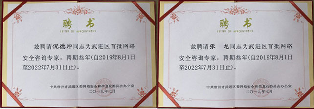 我公司倪德帥、張龍同志被聘為武進(jìn)區(qū)首批網(wǎng)絡(luò)安全咨詢專家。今后,將在中共常州市武進(jìn)區(qū)委網(wǎng)絡(luò)和信息化委員會辦公室的領(lǐng)導(dǎo)下發(fā)展自身的專業(yè)特長,有序的開展網(wǎng)絡(luò)安全相關(guān)工作,為武進(jìn)區(qū)網(wǎng)絡(luò)安全建設(shè)決策提供信息咨詢和專業(yè)支撐。