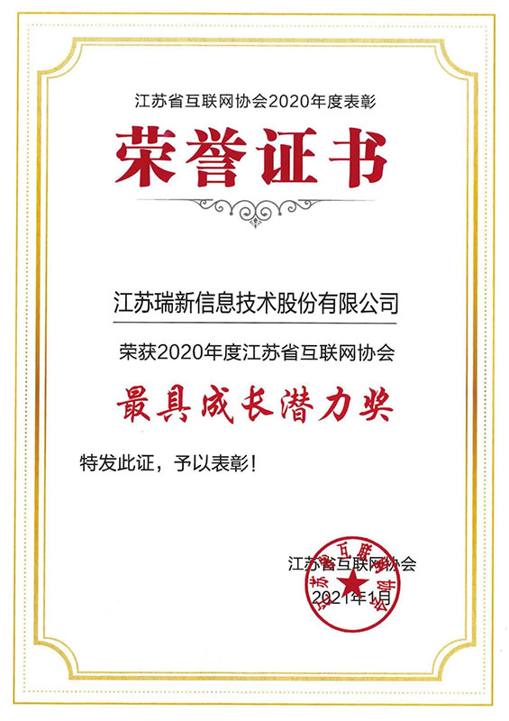2021年1月,我司榮獲2020年度江蘇省互聯(lián)網(wǎng)協(xié)會最具成長潛力獎。