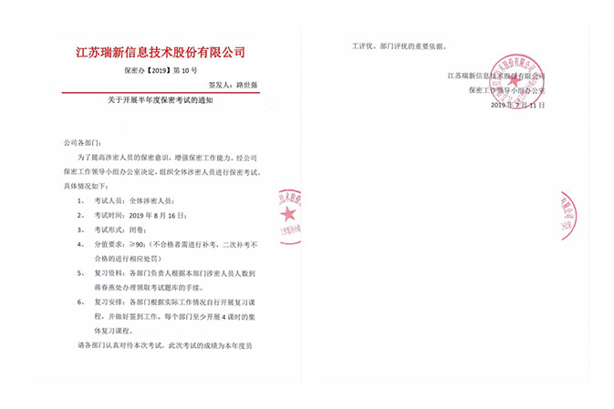 為了提高涉密人員的保密意識,增強(qiáng)保密工作能力。2019年7月11日,公司發(fā)布《關(guān)于開展半年度保密考試的通知》。