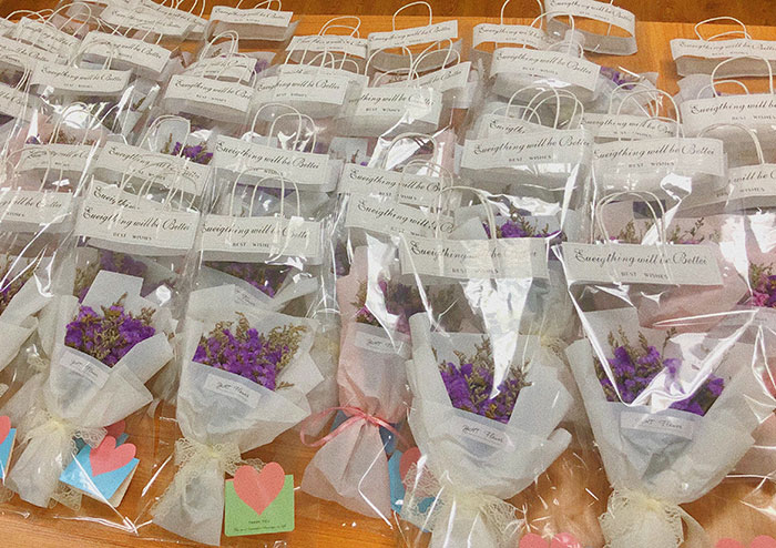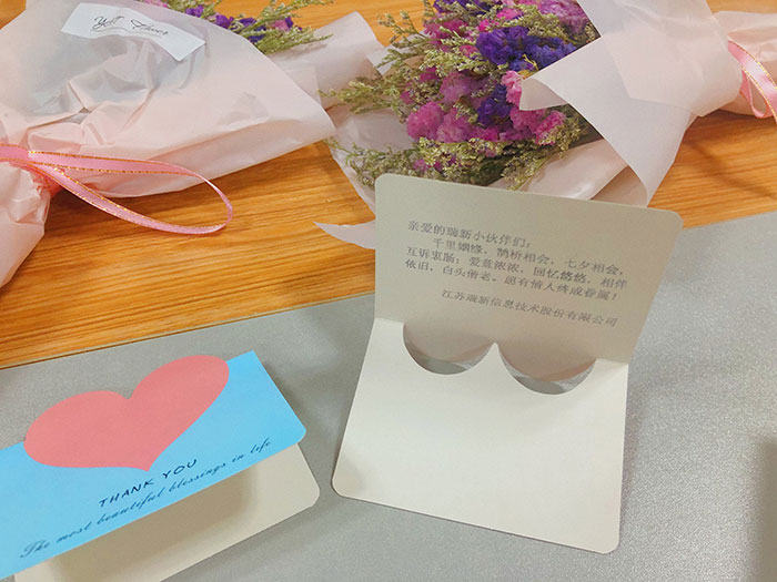 有別于傳統(tǒng)的做游戲、表演的聯(lián)誼會(huì),公司行政部同事親手包扎愛(ài)的小花束,將包好的小花束分發(fā)給瑞新小伙伴們?,F(xiàn)場(chǎng)氣氛熱烈,洋溢著溫馨甜蜜的氣息。