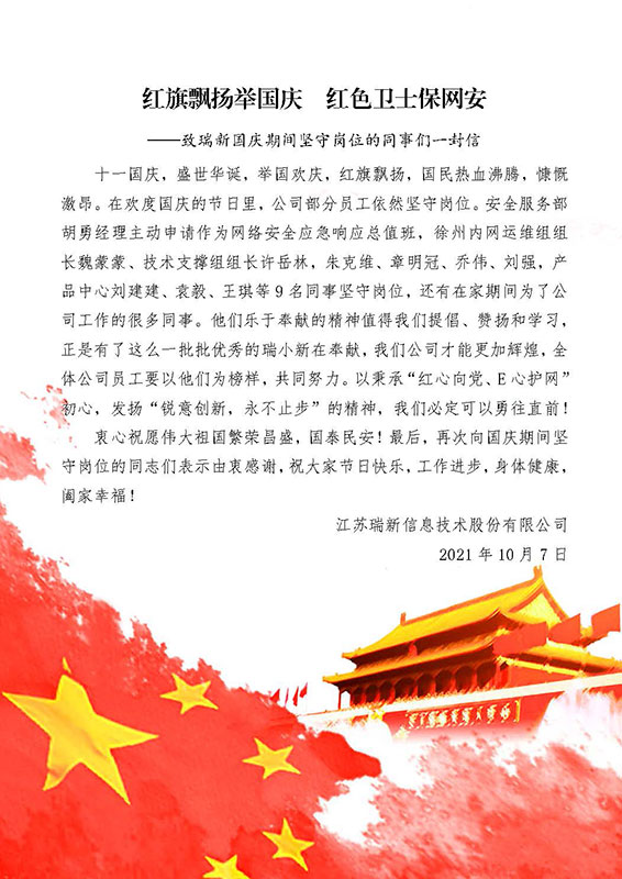 紅旗飄揚(yáng)舉國(guó)慶 紅色衛(wèi)士保網(wǎng)安——致瑞新國(guó)慶期間堅(jiān)守崗位的同事們一封信