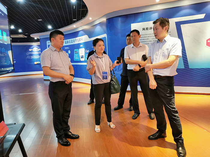 領(lǐng)導(dǎo)們一行首先參觀了公司產(chǎn)品展廳、網(wǎng)絡(luò)安全素養(yǎng)教育基地,詳細(xì)了解了公司的產(chǎn)品情況。隨后在會(huì)議上,由江蘇瑞新副總經(jīng)理張必友就公司發(fā)展、技術(shù)團(tuán)隊(duì)以及瑞新網(wǎng)絡(luò)安全監(jiān)管平臺(tái)向領(lǐng)導(dǎo)們做出了簡(jiǎn)要匯報(bào)。