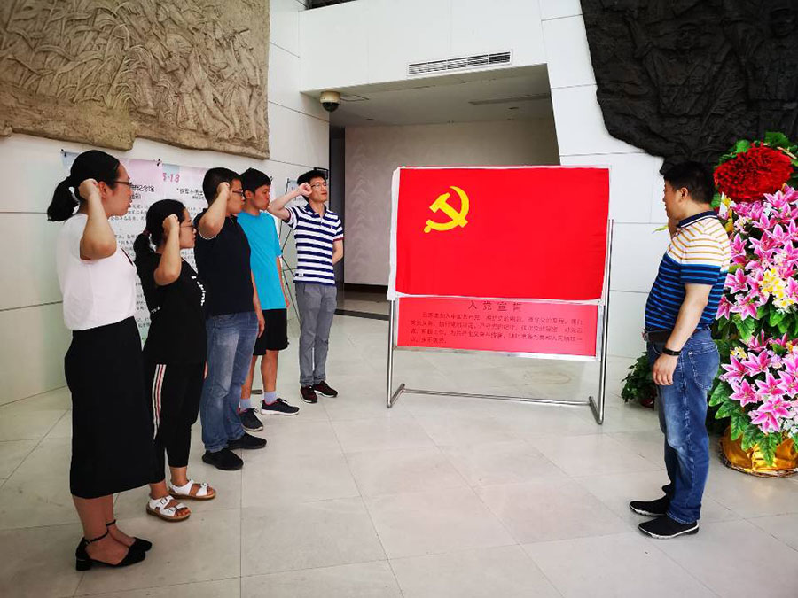 在陳毅、粟裕同志的銅像下,鮮紅的黨旗前,支部為新吸收為中共預(yù)備黨員的張龍同志舉行了宣誓儀式。眾位新老黨員也集體重溫了入黨誓詞,錚錚誓言擲地有聲,表達(dá)了我們的共產(chǎn)主義信念和決心。